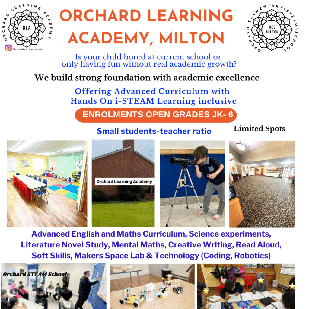 Welcome to Orchard Learning Academy, where curiosity blossoms! Orchard Learning Academy is a first i-STEAM (Science, Technology, Engineering, Arts and Mathematics) focused elementary educational institute in Milton, running classes from JK – Grade 6. Run by educators, university professors, scientists & engineers, the facility serves the educational needs of the growing community focusing on academic excellence, building strong educational foundations and preparing kids for the future. We are committed to provide high-quality education that exceeds the expectations of the Ontario Provincial Curriculum.